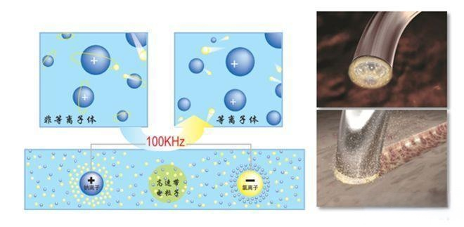 等离子刀采用脉冲射频技术,当刀头与人体组织接触时,射频电场使组织中的电解质液汽化分解,在刀头尖端产生包含自由电子、离子、中性化学基团和其他中性物质的等离子体蒸汽层。当等离子体中的带电粒子被电场加速后,可引起组织细胞的分子键断裂,促使细胞解体,达到切割和消融效果。